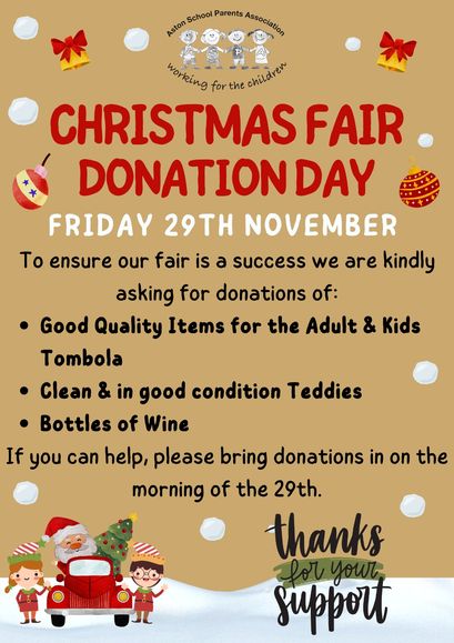 Please see the flyer regarding donations for the Christmas Fair